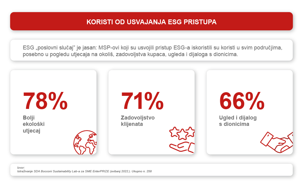 - Anketa koju je provelo sveučilište Bocconi pokazala je da se broj malih i srednjih poduzeća koja su prihvatila okolišni, socijalni i upravljački akcijski plan (ESG) povećao, dok se broj malih i srednjih poduzeća koja ne provode taj plan udvostručio