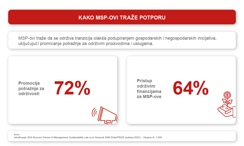 Anketom je otkriveno da je oko 25 posto vlasnika i voditelja malih i srednjih poduzeća izjavilo da su počeli provoditi plan za poboljšanje načina na koji posluju kako bi bili okolišno i društveno odgovorniji. To je u usporedbi sa samo 14 posto prije dvije godine. Međutim, više od 40 posto ispitanika izjavilo je da uopće nema plan održivosti, što je porast u odnosu na 20 posto od prije dvije godine, usprkos tome što rezultati ankete upućuju na to da je provedba okolišne i društvene poslovne strategije rezultirala većim zadovoljstvom klijenata, boljim ugledom, većom učinkovitošću te čak i povećanjem udjela na tržištu. Mala i srednja poduzeća traže da ih se podrži u njihovom održivom prijelazu pristupom održivim financijama, javnim poticajima za mala i srednja poduzeća i jačom promocijom kako bi se potaknula potražnja za održivim proizvodima i uslugama.